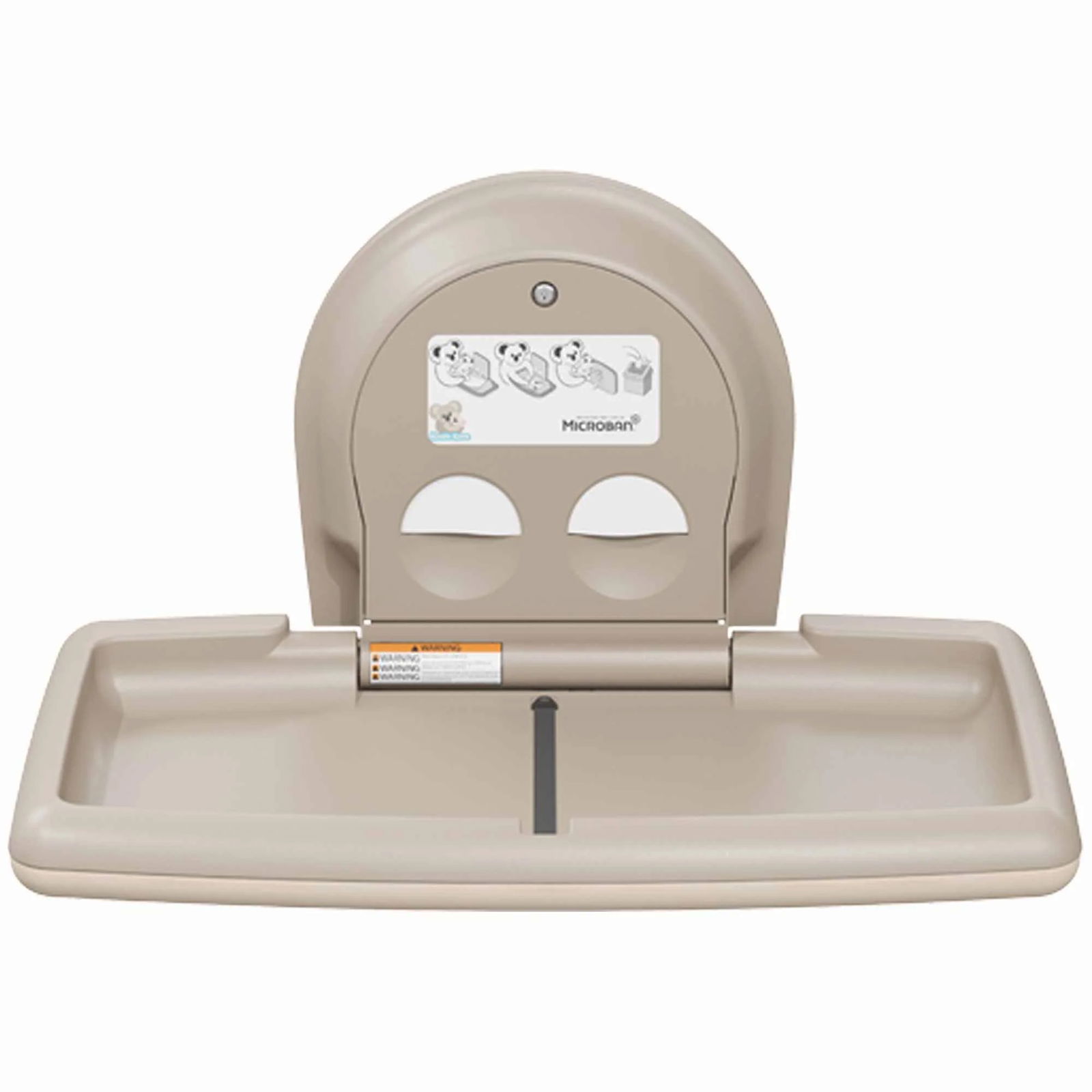 Die horizontale Aufputz-Wickelstation ist aus Polypropylen gefertigt und verfügt über ein stabiles Stahlgehäuse für höchste Stabilität. Zu den durchdachten Annehmlichkeiten gehören der Microban®-Produktschutz, ein neu gestalteter Beutelspender und das Koala-Markenzeichen, das den Familien Komfort und das Versprechen einer durchdachten Unterbringung vermittelt.