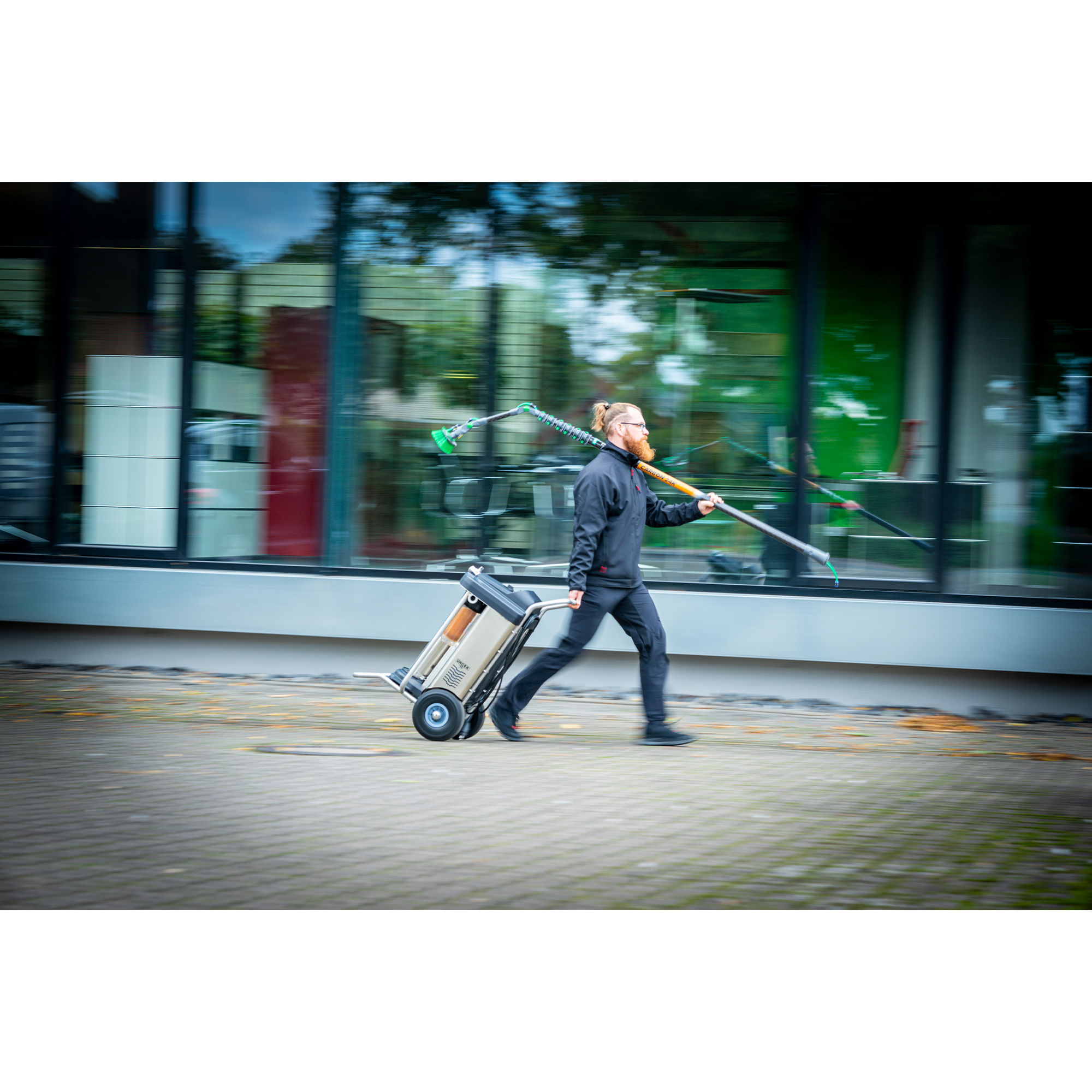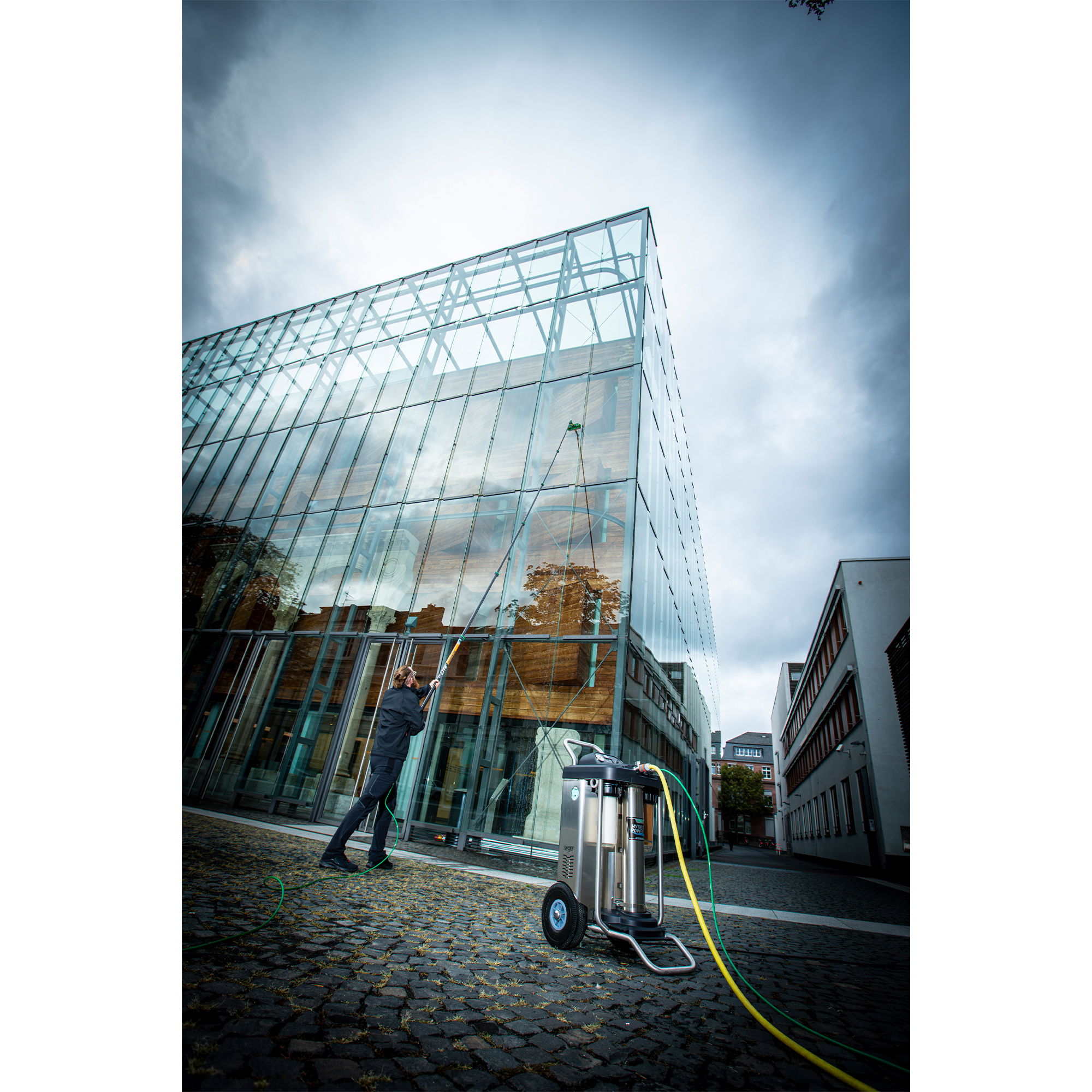 Das HydroPower RO S System von UNGER ermöglicht eine effiziente Reinigung mit Reinwasser bei geringen Investitions- und Betriebskosten. Besonders in Regionen mit hartem Wasser bietet das System eine wirtschaftliche Lösung für die professionelle Glas- und Fassadenreinigung.